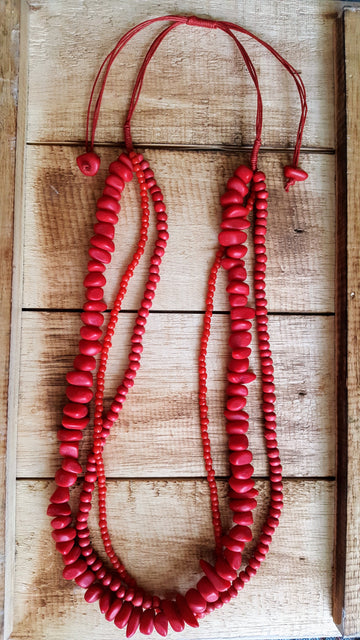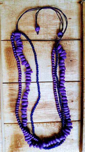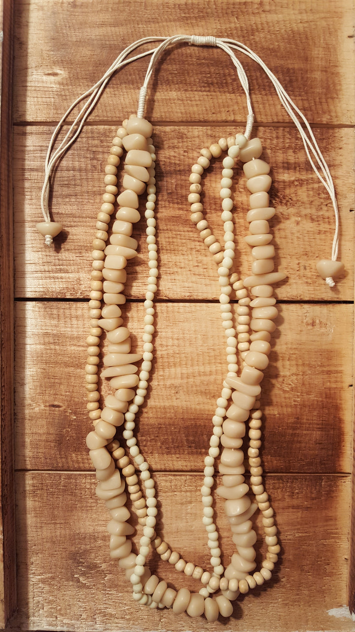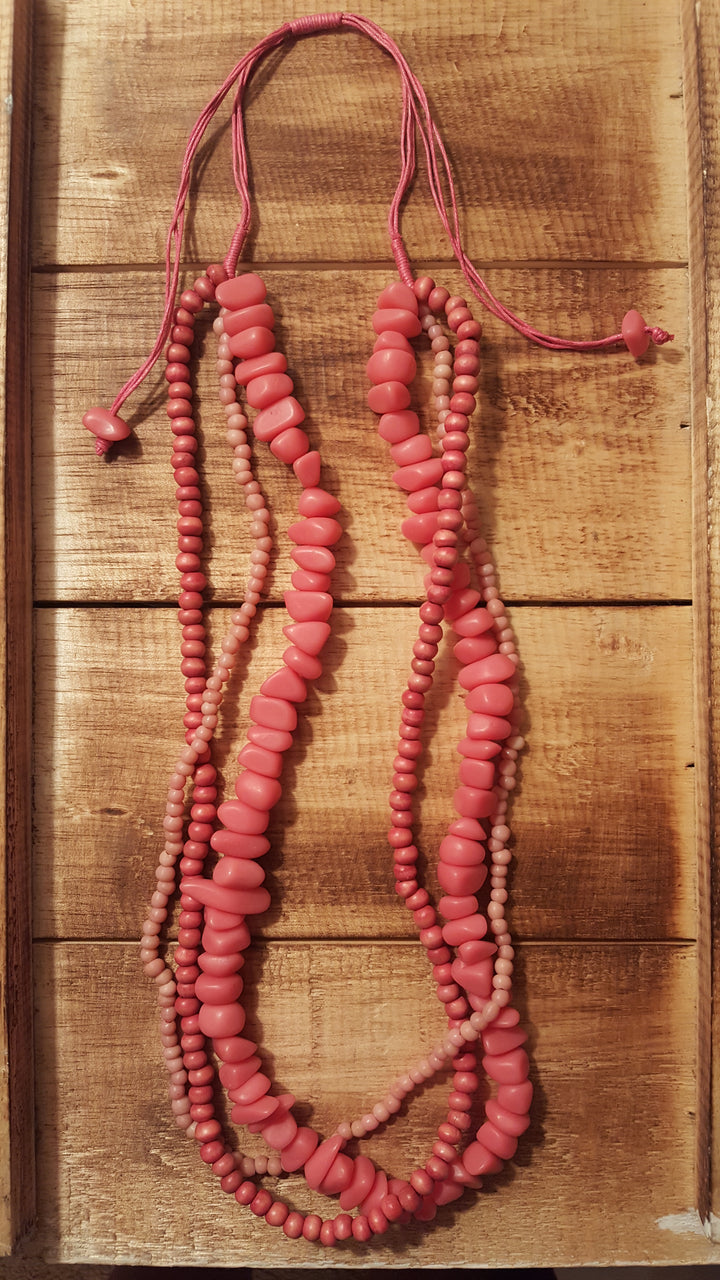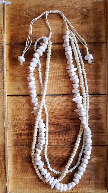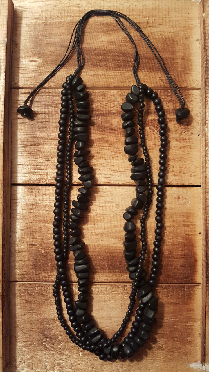 Cascading strands of glass, wood, and resin-cast beads with a slide system that adjusts from approximately 14-18 inches hanging length.  You will LOVE the layered design of this handcrafted multi-strand necklace, it never disappoints.  Go ahead, grab a few and wear them with everything!  You’ll be glad you did.